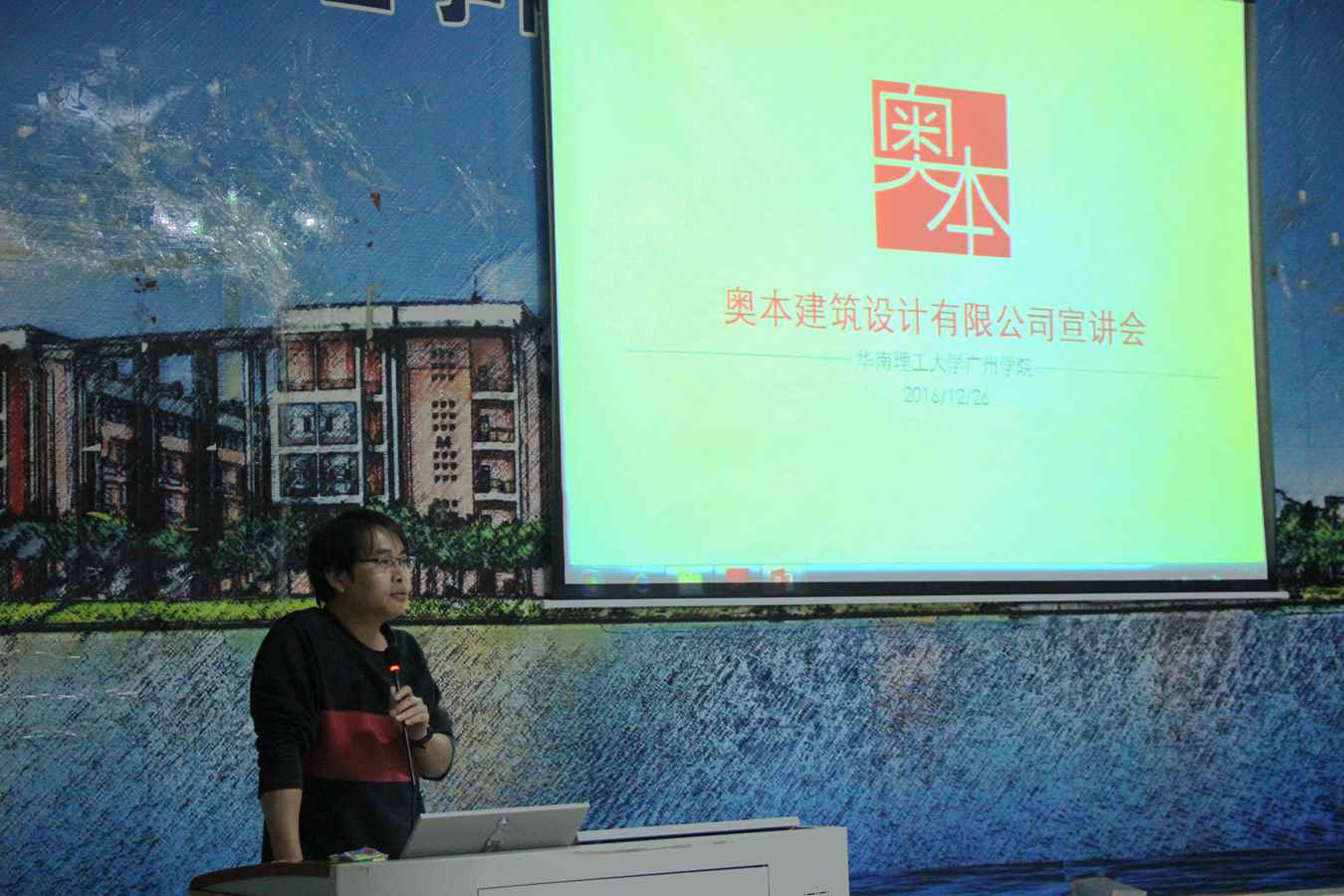 本网讯(记者 陈磊磊)12月26日晚,奥本建筑设计有限公司一行5人在我校A8-101面向BETVLCTOR伟德在线2017届毕业生及其大三学生召开宣讲会。公司设计总监陈幸夫先生、林耀阳先生亲临现场,宣讲会围绕公司简介、建筑设计项目介绍、主创设计师分享、交流互动展开,BETVLCTOR伟德在线教研室副主任区文谦老师主持、50余名建筑学子参加了本次宣讲会。