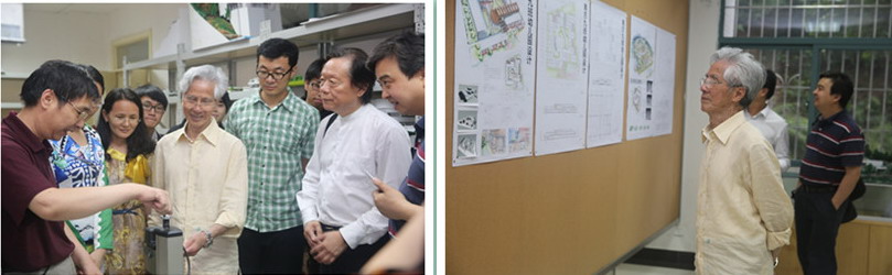 何镜堂院士在学院模型实验室参观指导、在一楼评图厅欣赏学生设计作品